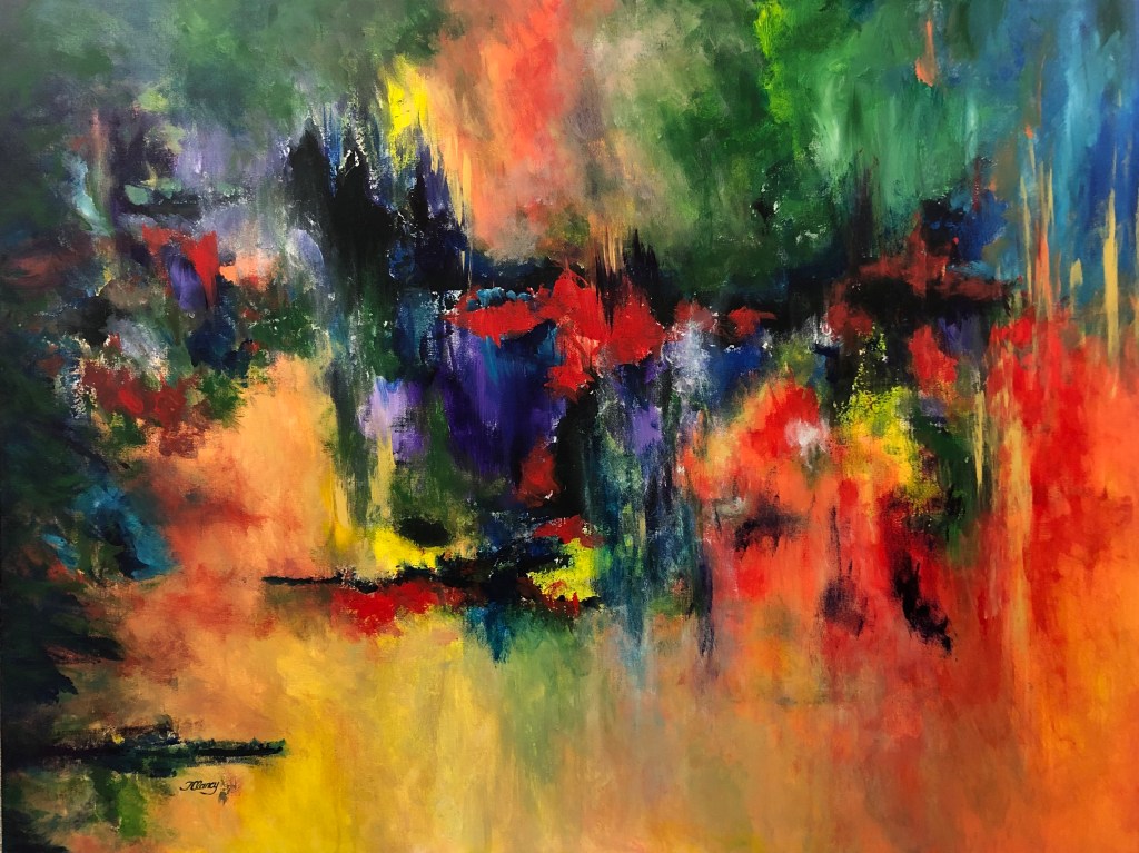 Tina: I have three: 1) complete, non-representational abstracts (as in A Night in Bordeaux) in which I can paint with broad, sweeping strokes, 2) blurry, misty, mysterious impressionistic abstracts, or abstract impressions, and 3) the method of pouring slightly diluted acrylics onto watercolour paper, which I have called Luminous Paper Painting. However, I still like to dabble and play with other approaches, just in case I find a new favourite!